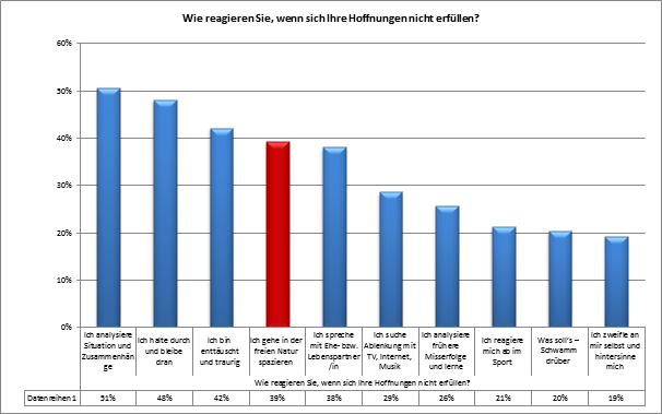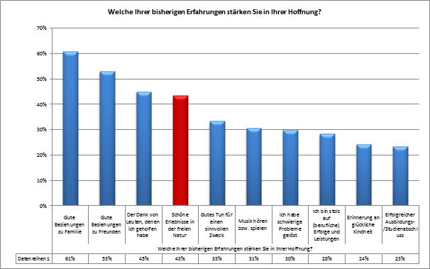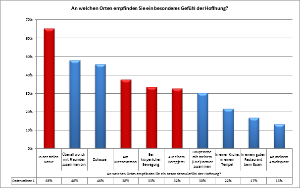 Nicht religiöse Orte, auch nicht Orte von Bildung, Fortschritt und grossen politischen oder wirtschaftlichen Erfolgen, sondern die eigene Naturerfahrung ist für den Schweizer die Quelle der Hoffnung. Seien es die Antworten auf die Frage „An welchen Orten empfinden Sie ein besonderes Gefühl der Hoffnung“, auf „Welche Ihrer bisherigen Erfahrungen stärken Sie in Ihrer Hoffnung?“ oder auf „Wie reagieren Sie, wenn sich Ihre Hoffnungen nicht erfüllen?“ – jedes Mal belegt die persönliche Erfahrung der Natur einen Spitzenplatz.