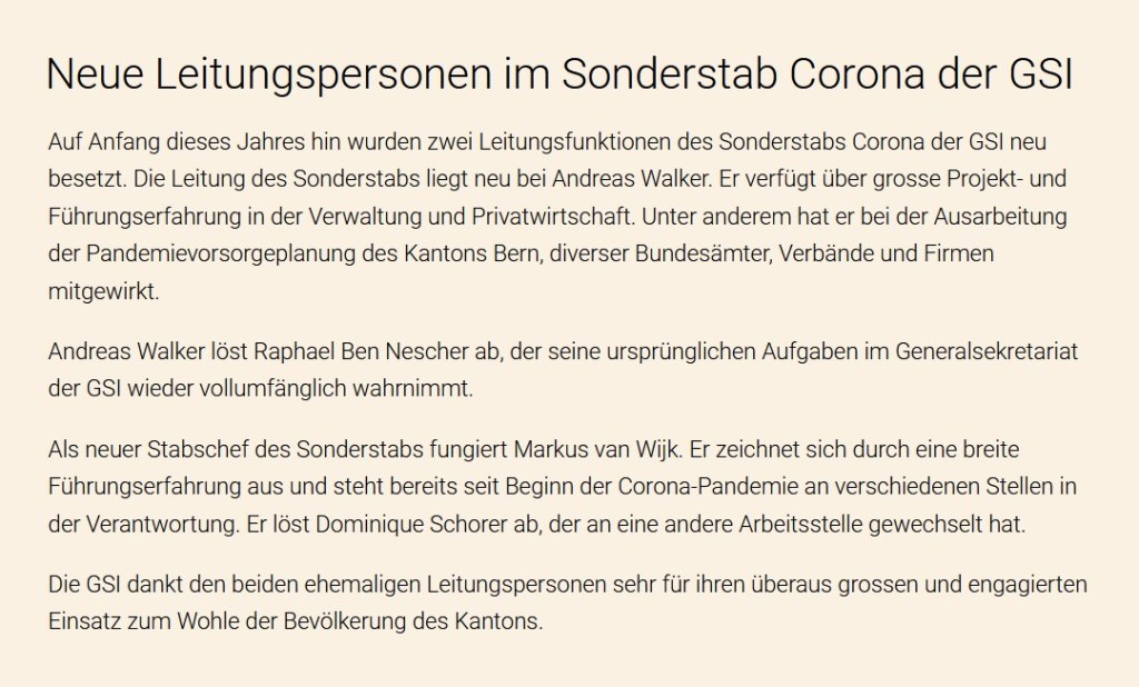 2022/23 leitete ich während der Corona-Pandemie den Sonderstab der Gesundheits-, Sozial- und Integrationsdirektion (GSI) des Kantons Bern.